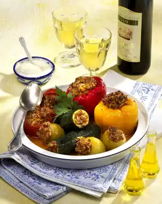 Knead minced meat, diced onion, parsley and tomato paste. Season with sweet paprika, salt and pepper. Mix in rice. Fill everything into the prepared vegetables