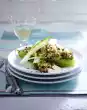 Mix with the salad ingredients. Cut vine leaves in half, slice sheep's cheese thinly, roast pine nuts in a dry pan until golden brown. Add to the salad and serve garnished with basil.