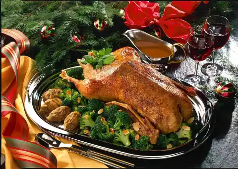 In the meantime clean and wash the broccoli and cut it into florets. Roast the almonds in a dry pan until golden brown and set aside. Steam broccoli in a little salted boiling water for 8-10 minutes. Remove the goose from the roasting pan and keep warm in the oven.