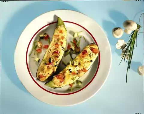 Wash the chives, dab dry and cut into small rolls. Add tomato cubes, rice and chives to the vegetables. Grate cheese and fold in the crème fraîche. Season to taste with salt and pepper. Fill the vegetable rice into the hollowed out zucchini. Put them into an ovenproof dish, pour on the broth and bake in a preheated oven (electric range: 200 °C/ gas: level 3) for about 20 minutes