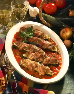 Mix tomatoes, remaining onions, garlic, finely diced zucchini and stock. Season with salt and pepper and place in an ovenproof dish. Fill the zucchini with minced meat. Wrap each one with a slice of bacon and put it into the dish. Bake in the preheated oven (electric cooker: 200 °C/ gas: level 3) for 30 minutes. Garnish filled zucchini with thyme if desired