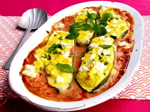 Spread the pureed zucchini feta mixture into the hollowed out zucchini. Crumble the rest of the feta and sprinkle over it. Bake in a hot oven for 30-40 minutes.