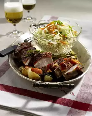 Wash meat, dab dry, cut rind into rhombuses. Season with salt and pepper. Cook in a roaster or the fat pan of the oven in a preheated oven (electric cooker: 200 °C/ circulating air: 175 °C/ gas: level 3) for about 1 hour. Peel 3 onions. Peel and wash 300 g carrots. Chop both roughly. Wash the herbs and shake dry. After 15 minutes add onions, carrots, herbs and 250 ml beer to the fat pan. Possibly add another 50 ml beer. Switch on the grill 5-10 minutes before the end of cooking time. Remove meat from the oven, wrap in aluminium foil and leave to rest for 10 minutes. Cut meat from the bone and slice. Arrange meat and vegetables with salad on a plate