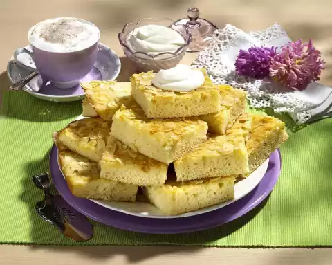 Fill the dough on top and smooth it down. Sprinkle with 100 g sugar and flaked almonds. Bake in the preheated oven (electric cooker: 175 °C/ convection oven: 150 °C/ gas: level 2) for 20-25 minutes. Remove the cake and make holes evenly with a shish kebab skewer.