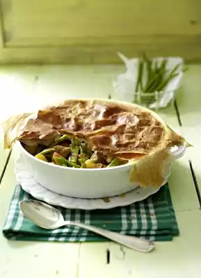 Bake in the preheated oven (electric cooker: 200 °C/ convection oven: 175 °C/ gas: level 3) for approx. 25 minutes. Roll up the remaining dough sheets again, pack well and use them for other purposes as soon as possible. Remove Baeckeoffe from the oven. Break open dough lid