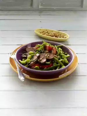 Roast the pine nuts in a pan without fat until golden brown, take them out. Clean and wash the green beans. Peel the broad beans. Blanch the beans in boiling water for about 5 minutes, drain.