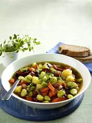 Bring to the boil, cover and cook for about 15 minutes. In the meantime wash parsley, shake dry and chop finely. Take the savory out of the stew, carefully season again with salt and pepper. Sprinkle with parsley and arrange in deep plates, garnished with a stalk of savory, as desired. Grey bread tastes good with it