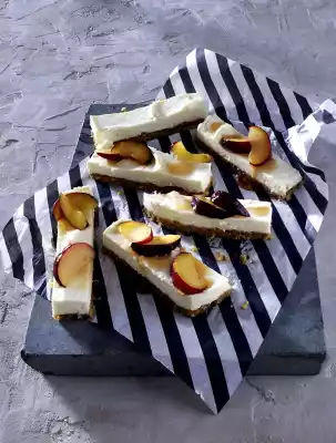 Wash the plums, grate them dry, halve them and remove stones. Cut plums into slices. Warm the jelly in a pot, remove from heat and let it cool down for about 5 minutes. Mix plums and jelly. Take the cake out of the tin and cut it into rectangular pieces (à 2 x 8 cm). Spread the plums on the pieces and serve