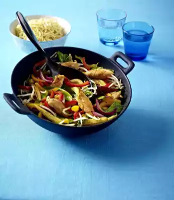 Mix honey, sherry, vinegar, 5 tbsp. soy sauce and approx. 1/2 tsp. sambal oelek. Pour the sauce over the vegetables. Add the sprouts and chicken meat and steam everything for about 2 minutes, turning. Carefully wash the coriander, shake dry and chop coarsely. Stir the coriander into the chicken-vegetable pan and season again with Sambal Oelek and soy sauce. Serve with wok noodles
