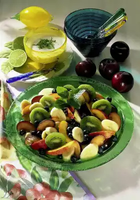 Wash the nectarines and plums and cut them into slices from the stone. Peel and slice kiwis and bananas. Wash and drain blueberries. Arrange salad ingredients in a bowl.