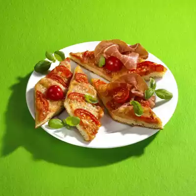 Place slices of tomato and mozzarella on top, alternating in flakes. Season with salt and pepper. Bake in the preheated oven, 2nd shelf from below (electric oven: 200 °C/ convection oven: 175 °C/ gas: level 3) for about 30 minutes. Let the pizza rest for about 10 minutes, then cut into rhombuses or long strips as you like. Halve the ham slices and spread them on the pizza pieces. Sprinkle with halved cherry tomatoes and remaining basil and garnish as desired