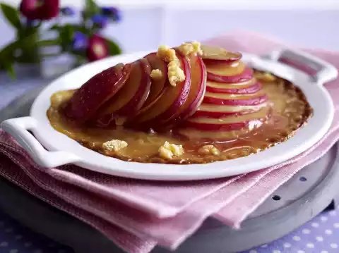 Place 2 plums on each small ovenproof plate and pour cream-caramel evenly over them. Gratinate in a preheated oven (electric cooker: 250 °C/ convection oven: 225 °C/ gas: level 5) for 4-5 minutes. Remove from the oven and sprinkle with the remaining chopped candy. Serve immediately