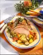 Mix lemon zest, peppercorns, coarse salt, onions and rosemary. After 30 minutes, pour 1/4 litre water and tomato juice over the roast. Add bay leaves. Press the crust lightly onto the roast. Meanwhile wash, clean and coarsely dice the zucchini and tomatoes. Peel, wash and also dice the potatoes. Fry in hot oil for five minutes, turning, adding the zucchini and tomatoes. Season with salt and pepper, fry for another five minutes. For the sauce, pour the stock through a sieve. Stir starch in a little cold water until smooth. Stir into the sauce, bring to the boil and season with salt and pepper. Refine with cream.
