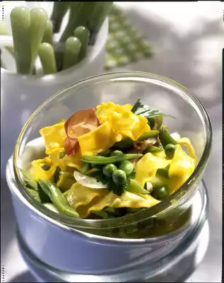Season with salt, pepper and sugar. Add onion slices and parsley. Mix pasta, beans and peas with the marinade. Cover and let stand for 30 minutes. Season again and serve with ham.