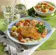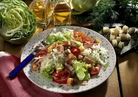 Remove the crusts from the bread and cut into cubes. Roast in a dry pan until golden brown. Clean, wash and cut iceberg lettuce into strips. Clean, wash and coarsely grate kohlrabi. Wash, clean and slice the tomatoes.