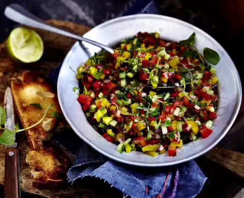 Mix tomatoes, peppers, cucumber, onions, herbs, lime zest and lime vinaigrette well. Leave to stand for approx. 30 minutes. Season again with salt, pepper and sugar. Serve.
