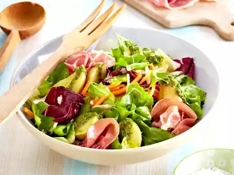 Drain the potatoes, rinse with cold water and cut in half lengthwise. Mix salad, potatoes and pesto. Arrange in a large bowl and garnish with ham florets. Add the remaining ham