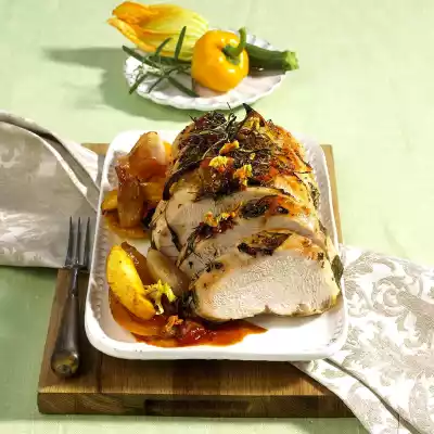 Clean, wash and cut the tomatoes into small cubes. Deglaze roast again with 250 ml water. Add zucchini, remaining lemon wedges and diced tomatoes. Season with salt and pepper. Finish cooking for another 30 minutes.