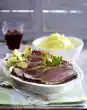 Remove the finished roast, cover with foil and let it rest for about 10 minutes. Sprinkle with remaining herbs and cut into slices. Add bread. Serve with lettuce