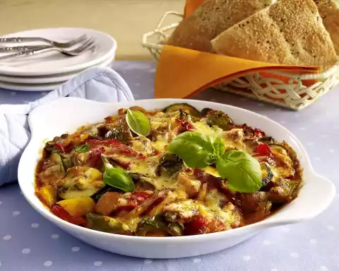 Wash the basil, cut into strips and add to the vegetables. Season to taste and place in a greased casserole dish. Grate the cheese coarsely and sprinkle over it. In a preheated oven.