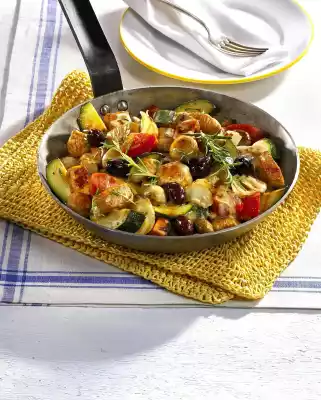 Wash tomatoes and chop roughly. Wash herbs and chop roughly. Season meat with salt and pepper. Take out. Fry onion and mushrooms in the frying fat for about 5 minutes. Add zucchini and fry for about 3 minutes. Add tomatoes, herbs and olives and fry briefly. Season vegetables with salt and pepper. Add meat again. Deglaze everything with 1/4 liter water. Bring to the boil, stir in broth and simmer everything open for about 5 minutes.