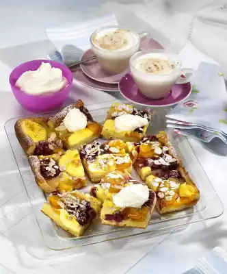 Roll out the dough on it, pressing a 1-2 cm high rim. Spread the cherries, peaches and stewed apples in large blobs on the dough, leaving a few spots for the pudding cream. Pour 1/4 litre of milk into a high mixing bowl, add cream powder and mix with the whisks of the hand mixer for 1 minute at lowest setting. Then whip on highest setting for approx. 1 minute. Quickly stir the crème fraîche into the pudding cream. Pour the pudding cream immediately as a blob into the gaps on the cake. Warm the jam and jelly separately and pass through a sieve. Spread cherries with redcurrant jelly and peaches with apricot jam. Sprinkle almonds on top. Bake the cake in a preheated oven (electric cooker: 200 °C/ convection oven: 175 °C/ gas: level 3) for approx. 30 minutes. After half of the baking time, cover the edges with aluminium foil if necessary. Let them cool down on a cake rack.