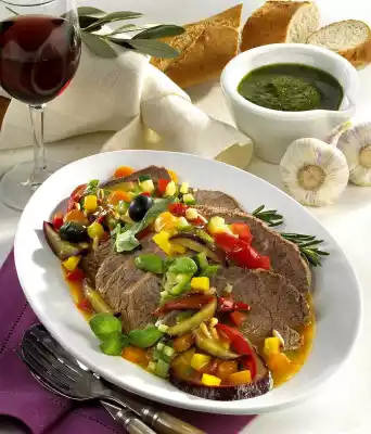 Roast pine nuts. Remove the boiled beef and cut open (use broth for other purposes). Serve with vegetables and pine nuts. Serve with baguette and pesto