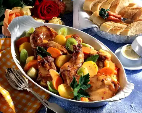 Cut the celery into pieces. Peel, wash and cut potatoes into thick slices. After 30 minutes stewing time add vegetables and potatoes to the rabbit and cook. Mix sour cream and flour and stir into the stock.