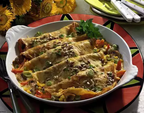 Heat some clarified butter in a pan and bake 8 pancakes one after the other until golden brown. Fill the pancakes with vegetable ragout, place them in an ovenproof dish, sprinkle with cheese and bake in the preheated oven (electric cooker: 200 °C/ gas: level 3) for approx. 15 minutes.