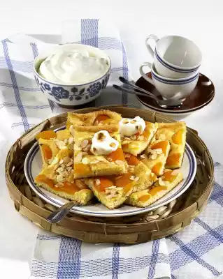 Grease the fat pan of the oven (32 x 39 cm). Fill in the dough, smooth it down and spread apricots on top. Bake in the preheated oven (electric cooker: 175 °C/ convection oven: 150 °C/ gas: level 2) for about 35 minutes. Take out, glaze the apricots with 10 g syrup and let them cool down. Roast almond flakes in a pan without fat until golden brown. Sprinkle the cake with it and cut into pieces