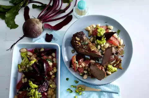 Sprinkle beetroot beans vegetables with pistachio oil. Sprinkle with parsley. Cut meat into slices and arrange with vegetables.