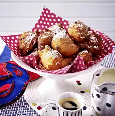 Heat oil or fat in a medium high pot. Use a teaspoon to cut off some of the dough and add it to the hot fat/oil using a second teaspoon. Bake about 8 pieces per portion in the hot fat/oil for about 3 minutes until golden brown. Lift out with a skimmer and let it drip off on kitchen paper. Dust with icing sugar as desired