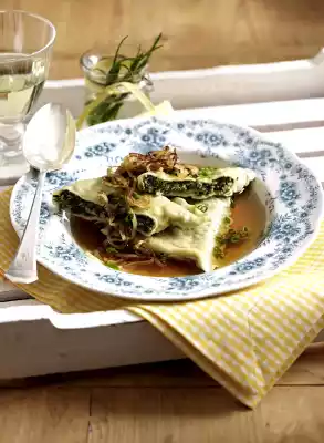 Peel 2 onions and cut or slice into thin rings. Wash the chives, shake dry and cut into fine rolls. Heat 3 tablespoons of oil in a frying pan and fry the onion rings until golden brown. Bring the meat stock to the boil and let the Maultaschen simmer for 6-8 minutes. Arrange the Maultaschen with the stock in portions on plates. Add onions and sprinkle with chives