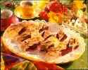 Add to the roulades with the tomato paste. Deglaze with 3/4 litre water, bring to the boil and cook for at least 1 hour. Wash the potatoes and cook covered with water for about 20 minutes. Drain potatoes, quench and cut into thick slices. Peel carrots, leaving some green. Cook in boiling salted water for about 12 minutes. Clean, wash and cut the pointed cabbage into pieces. Peel 1 onion and cut into fine cubes. Heat 20 g butter. Fry onion and cabbage in it, season with salt and pepper. Add 5 tablespoons of water and steam for another 5 minutes. Remove roulades from the sauce and keep warm. Stir flour with a little water until smooth and thicken the sauce with it, bring to the boil again. Season to taste with salt and pepper. Wash the parsley and chop it, except for something to garnish. Melt 30 g butter.