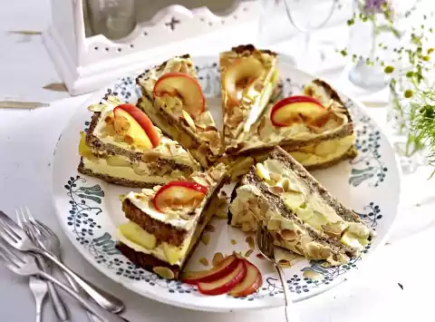 Whisk butter with the whisk of the hand mixer for 8-10 minutes until creamy. Gradually fold in the egg cream by the spoonful. Spread about half of the cream on a base and spread. Spread apple pieces on top. Place the second cake base on top, press down carefully and spread the rest of the cream on top, sprinkle with almond flakes immediately. Chill for at least 1 hour