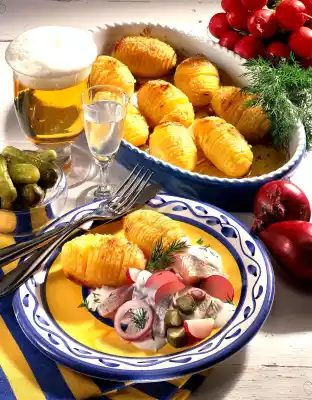 Mix sour cream and yoghurt. Season to taste with salt, pepper and a little sugar. Wash the dill, chop finely and stir into the sauce. Mix with matie, onions, radishes and gherkins. Serve with the baked potatoes