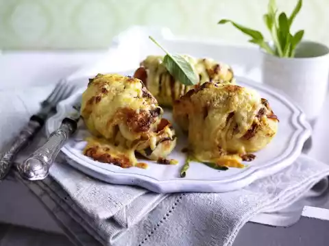 Wash the sage, shake dry and pluck off the leaves. Cut the ham slices into thirds. Peel and wash the potatoes and then cut them in close together, but do not cut through. Distribute 3 ham slices and 3-4 sage leaves in each of the compartments.
