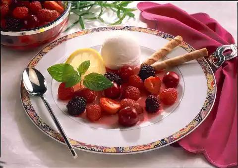 Arrange the fruit and a scoop of lemon sorbet on plates. Serve garnished with lemon and lemon balm. Serve with a wafer roll.