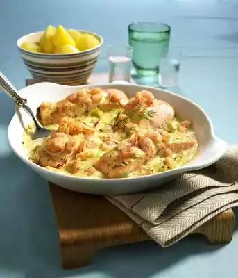 Stir the dill into the sauce. Fill cucumbers into a greased casserole dish. Place salmon on top. Pour sauce over it and spread prawns over it. Cook in the preheated oven (electric cooker: 175 °C/ convection oven: 150 °C/ gas: level 2) for about 20 minutes. Garnish with dill. Boiled potatoes taste good with it