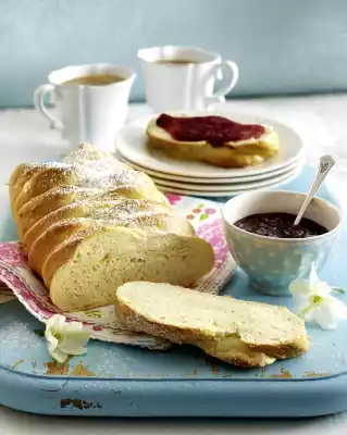 Fold over the dough strands one after the other alternately towards the middle and press down slightly. Cover and let rise again for about 20 minutes. Whisk the egg yolks and 3 tbsp. water. Spread bread with it. Bake in the preheated oven (electric cooker: 175 °C/ convection oven: 150 °C/ gas: level 2) for 20-25 minutes. Take out bread, let it cool down and dust with icing sugar