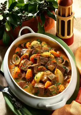 Add carrot slices and onion slices to the meat. Heat everything once again. Pour the ragout into a bowl. Wash parsley, chop finely and sprinkle over the ragout. Serve with mashed potatoes and lettuce.