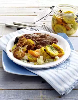 Cut the corncobs into slices. Wash the dill, dab dry and pluck the flags. Put the vegetables, onions and dill into 2 clean glasses (approx. 750 ml content). For the brew, boil vinegar, 750 ml water, sugar, mustard seeds, peppercorns, 2-3 tsp. salt. Distribute the brew into the glasses so that the vegetables are covered. (For longer storage, pour off the brew after one day, bring to the boil again and stir in the preserving aid. Pour the hot brew over the vegetables again and close the glasses immediately. Stored in a cool and dark place the vegetables will keep for 2-3 months). Wash the potatoes and cook in boiling water for 20-25 minutes. Drain, quench, peel and let cool. Meanwhile wash the meat, dab dry and season with salt and pepper. Heat 1 tbsp. clarified butter in a pan. Cook meat in 2 portions, turning for 6-8 minutes at medium heat.