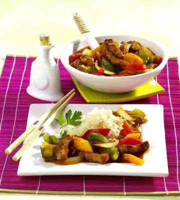 Season again with Sambal-Oelek and salt. Pour the rice onto a sieve and drain. Serve pork "sweet and sour" with the rice.