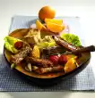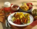 Take them out with a skimmer and let them drip off on kitchen paper. Heat the remaining oil. Add the bell peppers, carrots and spring onions to the wok and stir-fry. Stir the seasoning sauce again and pour into the wok, bring to the boil while stirring. Add pineapple pieces and cook over medium heat for about 2 minutes. Add the meat and also heat for another 1 minute. Arrange in portions and add rice. Garnish with chillies, Asian chives and coriander as desired