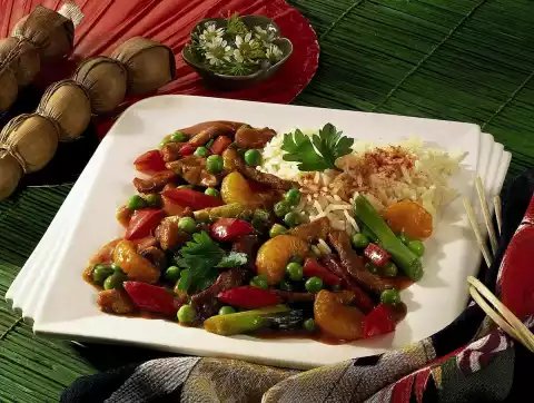 Add soy sauce and ketchup and stir in. Deglaze with 4 tablespoons of mandarin juice and stock. Add peas. Bring to the boil. Stir the starch with 4 tablespoons of water until smooth, add to the meat and bring to the boil again.