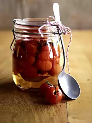 Distribute shallots, bay leaf, ginger, allspice and peppercorns evenly into the glasses. Add the tomatoes evenly. Pour boiling stock over them. Close the glasses tightly with a wake-up ring and clip them together