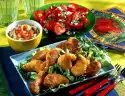 Wash the meat, dab dry and dice. Heat oil in a pan and fry the meat in it at medium heat until golden brown all around. Remove from the pan. Steam the bell peppers, cucumber and onion in the frying fat for about 3 minutes.