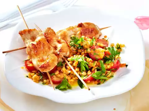 Meanwhile wash the meat, dab dry and cut lengthwise into thin strips (approx. 1⁄2 cm). Put the chicken strips on wooden skewers in a wavy pattern. Heat 1 tablespoon of oil in a coated pan and fry the skewers in it in portions all around for about 5 minutes.