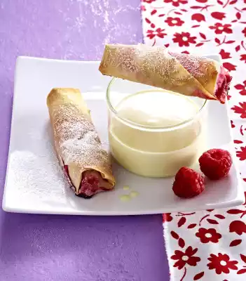 Dust the nems with icing sugar before serving. Add the chocolate sauce.