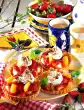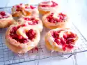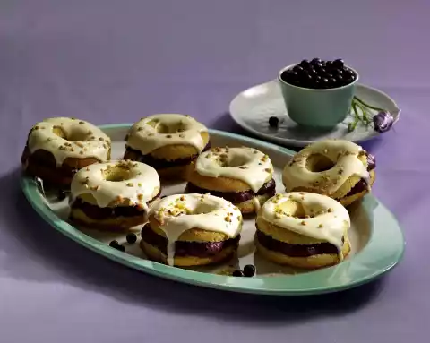 Bake in a preheated oven (electric cooker: 200 °C/ convection oven: 175 °C/ gas: level 3) for 20-25 minutes. Remove the wreaths from the cavities and let them cool down on a cake rack. Soak the gelatine. Rinse and sort blueberries. Puree blueberries and 60 g sugar. Squeeze the gelatine and dissolve. Stir 2-3 tablespoons blueberry puree into the gelatine, stir everything into the puree. Chill the puree until it begins to gel. Whip the cream until stiff and fold into the puree. Pour into a piping bag with perforated spout. Halve the wreaths. Spray puree tuffs onto the lower wreaths.